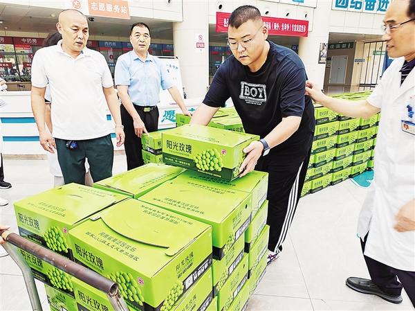 9月7日下午,來自黃泛區(qū)農(nóng)場(chǎng)的時(shí)先生(右二)將270箱自家農(nóng)場(chǎng)種植的葡萄捐贈(zèng)給周口港區(qū)醫(yī)院,與醫(yī)護(hù)人員一起分享雙重喜悅:自家果園的豐收和他個(gè)人的身體康復(fù)。