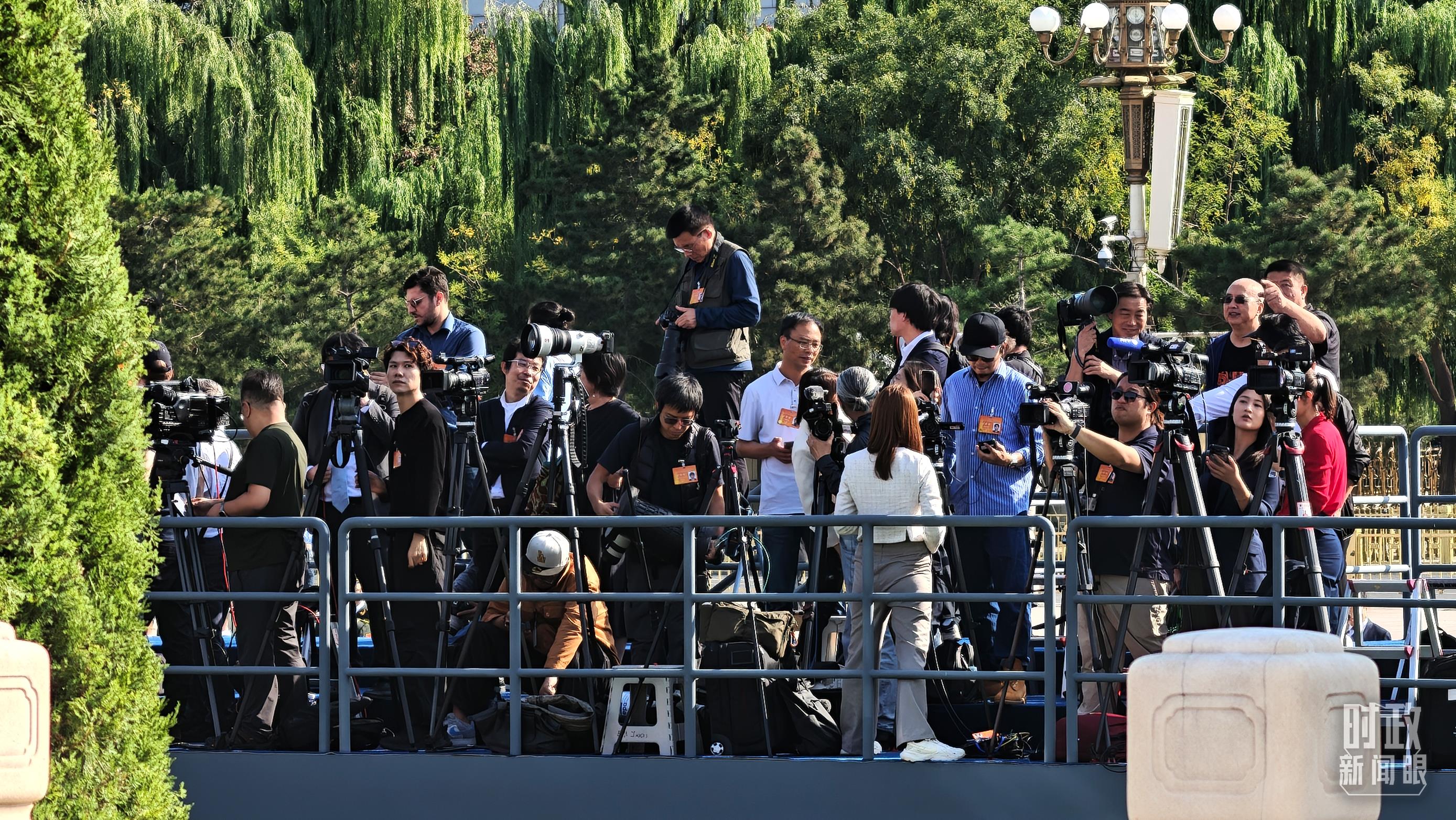 △9月30日,天安門廣場上現(xiàn)場報道的記者。(總臺央視記者鄂介甫拍攝)