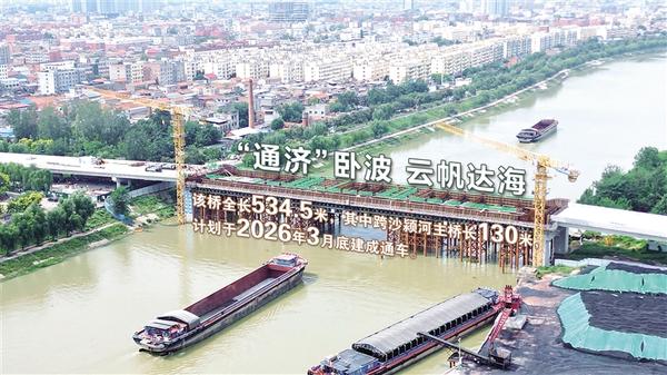9月16日上午,建設(shè)中的項城通濟大道橋臥波于沙潁河之上,貨船從30米寬的通航孔緩緩馳過,保障豫貨出海。